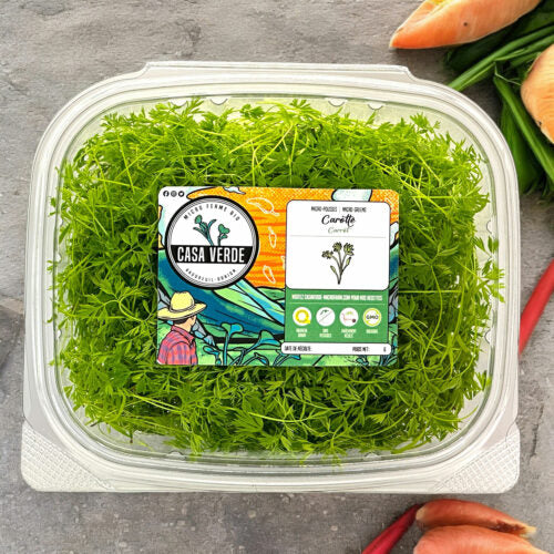 Les fanes de carottes sont utilisées depuis longtemps dans la cuisine européenne et moyen-orientale pour leurs qualités aromatiques et naturellement sucrées. Chez Casa Verde Microfarm , nous cultivons des micro-pousses de carottes pour obtenir l'équilibre parfait entre douceur, tendreté et structure foliaire fine et délicate.